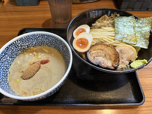 【味・量・提供】 ・つけ汁:原材料の90%超を鶏が占め、羅臼昆布・瀬戸内の煮干し・枕崎の鯖など魚介をブレンド。豚骨は「風味付け程度」と店内掲示にあり。コラーゲン感でどろっと濃厚だが、後味はだれにくいタイプ。 ・麺:全粒粉まじりの極太でコシが強く、つけ汁をしっかり持ち上げる。提供は体感早め。 ・薬味・構成:麺皿にわさびが添えられる実例が多く、途中の味変に好相性。卓上ポットでスープ割り可。