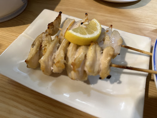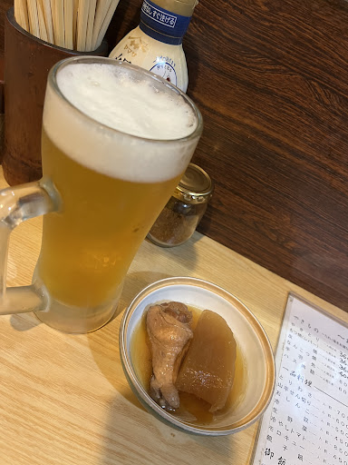 お通しは味の染み込んだ大根とほろほろの鶏モモ。とりわさは思ったよりも量が多く、一人で食べ切るには結構ツラい。焼き鳥はボリューミーで食べ応え充分。メニューは2本で記載されていますが、1本からでもオーダー可能です。塩にはレモンが付き、タレはやや辛めの味付けでした。