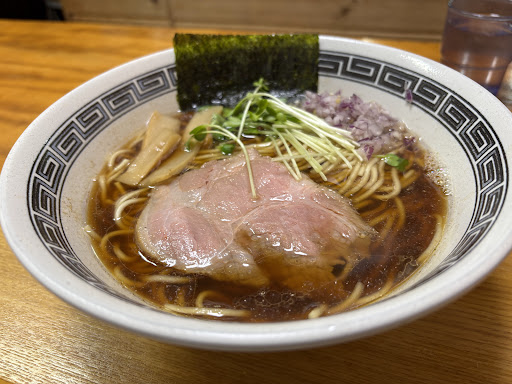 10分ほど待って着丼。綺麗な見た目のラーメン スープは醤油感が強く、あまり煮干しは感じないがコク深く旨味がしっかりしており、中細のストレート系の麺によく絡んで美味しい😋 トッピングは、チャーシュー・紫玉ねぎ・カイワレ・メンマ・海苔。特に薄切りのチャーシューは肉の旨味をしっかり感じられて美味しかった ただ、他のラーメン屋と比較をして、突出するものはあまりなく普通に美味しいラーメン屋という印象
