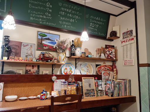 店内にはイタリアの皿や花瓶などの陶器やおもちゃが棚に陳列されていました。イタリアへの愛情や馴染みが伝わるデコレーションでした。 あと大きくて、とても立派なピザ窯が印象的でした。