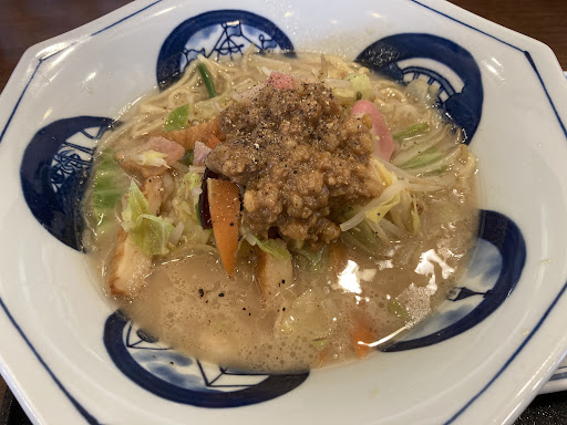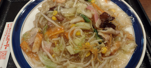 Read more美味しいです。いつもちゃんぽんにするか皿うどんにするか悩んで大抵ちゃんぽんの麺1.5倍や2倍(増量しても無料)を注文します。 皿うどんも麺の増量をやっていますが+100円なので。 どちらも野菜が沢山入っているので普通のラーメンよりこちらを選択してしまいます。 ちゃんぽんの麺は太麺で食べ応え十分、野菜炒めに木耳、豚肉、海老、さつま揚げ、紅白蒲鉾、コーン等々沢山の具材がこれでもかと麺の上に盛られて来ます。 皿うどんは揚げたパリパリ麺の上にとろみのきいた野菜炒めのあんが乗っていて(具はちゃんぽんと同じ)絡めて食べるとトロリ+パリパリ+他の具材の味がバランス良いです。 どちらも一気に食べたい人用のメニューもありますので是非是非。