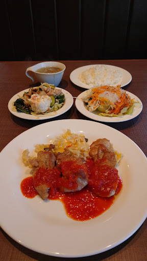 平日限定の日替わりランチのチキンソテートマトソース、サラダバー付1408円(サラダバー スープバー ご飯 パンお代わり自由)をライスで注文し、サラダを取りに行く。