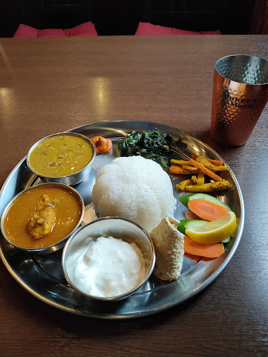 よくあるカレー、ナンのセットよりも、ネパールスペシャルセットが気になりオーダー。 大きな丸い銀皿に盛られたカレー2種類、アチャール、パゴタ、ヨーグルトに真ん中にライス。見た目から美味しそうだし、運ばれた時のカレーのスパイスの香りが◎