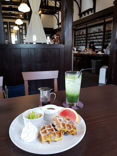 テラス席もあり、店内は黒の木目調で落ち着いた雰囲気でブレンドコーヒーのモーニングセット450円です。 おばけのマールとのコラボモーニングは飲み物+100円です。可愛くてワッフルも美味...