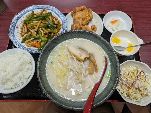 Read more夜お店の前を通ると看板の電気も消えていて、やってるのかどうかもわからないんですが、恐る恐る中に入ると、おじさんが「イラッシャイマセ」と迎えてくれました。 他に客は誰もいなかったんですが、メニューには定食もあり、ほとんどの定食にラーメンと唐揚げがついているので、すごいボリュームです。 青椒肉絲定食を頼みましたが、豚骨ラーメンも普通に食べれてコスパ最強ですね。 支払いの際、メニューは1050円となってましたが、税込みだと1100円なのかわからないけど、ペイペイで支払いました。 安いから別にいいんだけど誤解を招くので、メニューの金額を税込みで記載したほうがいいと思いました。 何度も「アリガトウ」と言ってくれたので、「こちらこそアリガトウ、ご馳走様でした。...