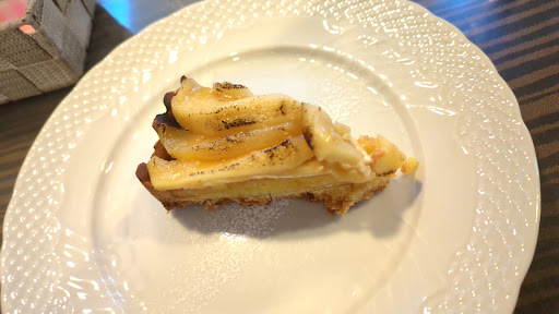 ■セットのデザート ガトーショコラを頼んだのですが、味はまあ普通として生地がパサパサです。 付け合せは缶詰のモモを角切りにした物。 チョコ生地に全く合わない上に、缶詰のシロップがなぜかたくさん掛けられていて、それが皿上に広がり、ガトーショコラの底がベチャベチャになっていました。 非常に残念です。