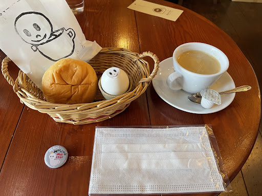 基本はマスクを一枚ついてくるのがベース。 350円でドリンク、ゆで卵、あんぱん。 おばけのマールのモーニングをやってたので 注文、マイスターバッジゲット。