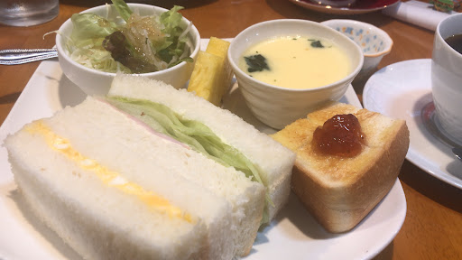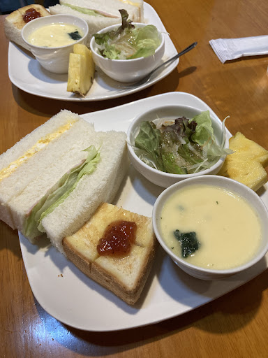 サービスモーニング すごいボリュームでした😅 コーンスープ(茶碗蒸しかチョイスできます) サラダ ジャムトースト(小) ハム、たまごサンド(焼いてもらえました!) パイナップル デザート(桃🍑のゼリー)