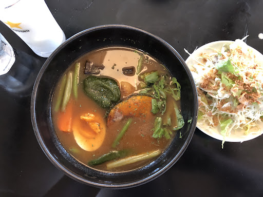 Read more店内はキレイです。すごくキレイ。 スープカレーは、何軒か行ってますが、残念ながら私の口には合いませんでした。 ほかにも残念なのが、猛烈に混んでいるわけでもないのにサラダ、飲み物、カレーが来ても、食器のセットを言うまで持ってきてくれないこと、後ろの席のほかのお客さんも同様でした。 あと最後に、たまたまだと思いますが、サラダの中に食器を洗うメタルのタワシのカケラがありました。接客も、食事づくりも気をつけていただきたいです。特にお客さんの口に入るものには注意を払っていただきたい。 あと男性トイレの鍵が壊れているのか人がいなくてもドアの印が赤いです。ノックして返しがない...