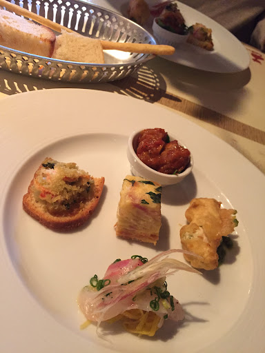 そして、前菜5種のプレート。 これが凄いーどれもこれも素材の良さもさることながら、丁寧に手が入れてあって、シェフのセンスが光ります。今回のプレートは、牡蠣のトマト煮が特に印象的だった。キッシュも美味しかった!
