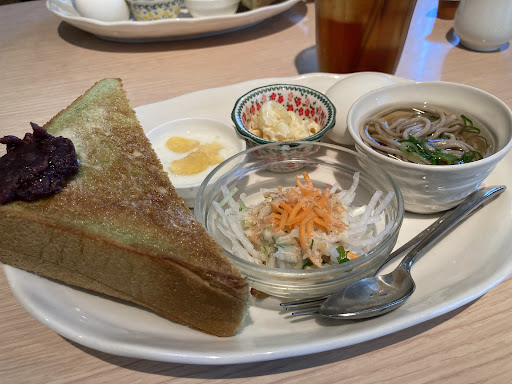 Read more初めてモーニングで伺いました。外観は洋風でオシャレな感じ。店内に入るとコーヒーの良い香りが漂って来てホッコリ❣️満席だったのですが、少し待っただけで席に案内して頂きました。座席が有る空間は広く感じました。注文したのはブレンド珈琲とアイスカフェオレ、トーストはシナモントーストと卵マヨトースト、野菜サラダ、マカロニ、ヨーグルトに蕎麦。パートナーのモーニングにはゆで卵も付いていました。料理は全て美味しく、お店のスタッフさんも感じが良かった...