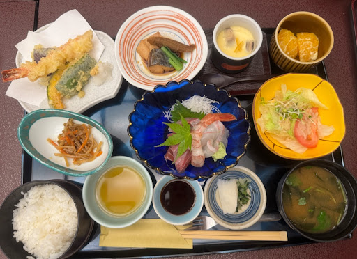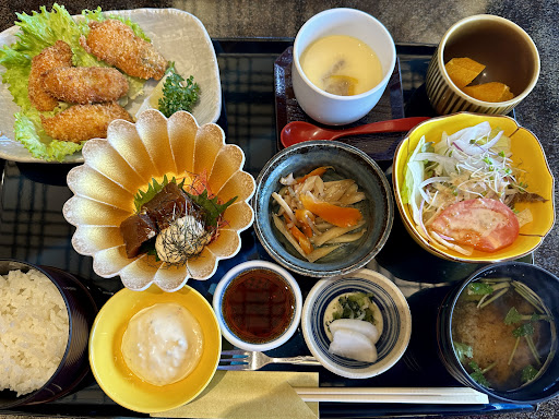 カキフライ膳はカキフライ、漬けまぐろ、きんぴらごぼう、サラダ、茶碗蒸し、お漬物、ごはん、フルーツが大きなお盆に配置されています。 カキフライはたっぷりのタルタルソース。カラッと揚がり具合が嬉しい。漬けまぐろもしっかり漬けてあって、とろろが添えてあります。そして、ごはんが美味しい。 ボリュームもあって、彩り豊かなお膳でした。