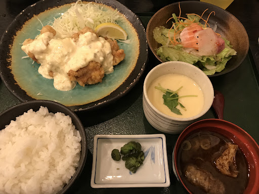 特製チキン南蛮御膳(¥1,200)を注文。 揚げたてのチキン南蛮はサクサクであり、普通に美味しかった。 また、サラダにはお刺身も乗っており、カルパッチョ風で良かった。