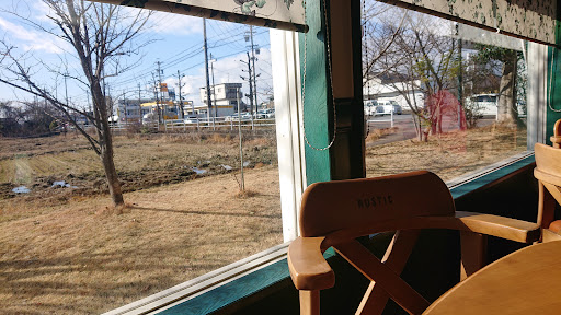 イオンモール木曽川の西方にある戸建カフェは南側に田んぼが広がる立地で、のどかな田園風景を白とグリーンの壁の大きな窓越しに眺められる洋風カントリーなカフェである。 木のフローリングにナチュラルウッドのテーブル席が6卓程窓際に並んでいる。