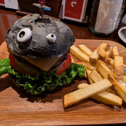 Read more水曜日の12時50分頃に来店しました。 お客さんは1人だったので、平日の昼時は少ないのかな?と思いました。 店内はアメリカンなバーみたいな雰囲気でオシャレでした。 夜だと映えると思います。 バーガーなどいろいろ種類があり、かなり迷います。 今回は、ニンジャチーズバーガーにトッピングで黒毛和牛でトマト抜きで頼みました。 ランチ時間だとポテトとサラダとスープが付いてドリンクは、100円引きだそうです。 食べた感想は、美味い! パティの肉感は凄い!バンズも竹炭の香りがあり、ふっくらして美味い! 野菜も美味いし、チーズもほどよい量で完璧です。 ポテトも美味しいですが、個人的にはもう少し塩気があっても良いかなと思いました。 あとマスターが、見た目とは違い、丁寧な接客と説明してくれます。 シェイクがあるみたいなので、女性に...