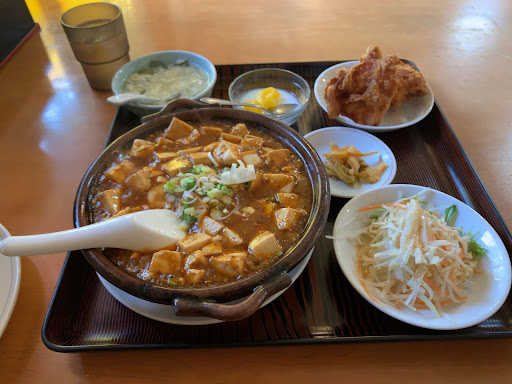 少ししてメインの麻婆豆腐定食がやってきた。 麻婆豆腐・小サラダ・唐揚げ大✖️2・スープ・杏仁豆腐・ザーサイ?と盛りだくさん。