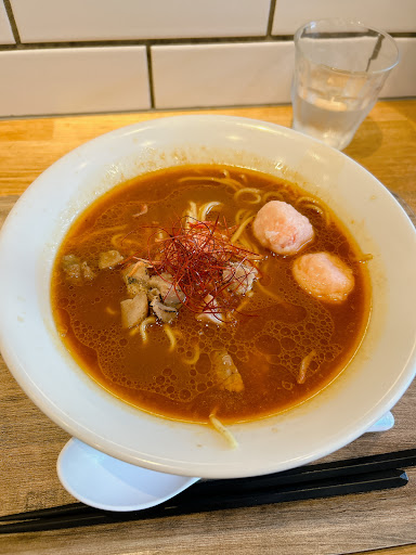 Read more九十九里で宿泊する前にお昼はラーメン!となり、色々探したところ美味しそうだったこちらのお店に伺いました。駐車場はぱっと見お店の正面に2台分です。中に入るとおしゃれなカフェ空間。テーブル、カウンター、お座敷席あり。家族連れもウェルカムな雰囲気です。 注文は着席後店員さんを呼ぶスタイルです。ちょうどお昼時で忙しそうでした。メニューを決めてから、店員さんがお水を持ってきて下さるタイミングで注文するのがベストかもです。 変わり種な海老味噌ラーメンを注文しました。海老出汁がとても濃厚!炙った角切りの焼豚も美味しい。麺とスープがよく絡みとても味わい深いラーメンでした。糸唐辛子のアクセントも素敵です。 お腹ぺこぺこだったので、おにぎりも頂きましたがこちらも美味しかったです。お米の炊き加減最高でした。 この日だけだったかは分からないのですが2人で営業を回している感じだったので、すごく急いでいる方は待ちぼうけしてしまう可能性もあるかも、、というのをお店側も危惧してか、席があいてもスムーズにご案内出来なさそうな時は入り口扉に満席の張り紙を貼られているようです。 夏は限定で冷やし...