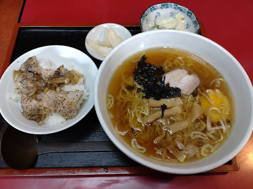 函館!? 豚丼は帯広、十勝地方の名物なのに(笑) まあ、遠く離れた千厩なので良しとして、ランチを注文。 まあ、なんの変哲も無い縮れ中華麺と透き通った醤油スープ。中華スープの元の様なお味でしたが、まあ悪くはないです。チャーシューにワカメ、メンマ、ゆで卵となかなかのトッピング。 何故かソーセージ2本がつけ添え小鉢でした。 函館名物なる豚丼は、十勝のものを目指した甘辛醤油味でまあまあです。もう少し付け焼してコクのある味なら最高です。 と言った感じに書いてますが、全体的には美味しい町の中華屋さん...