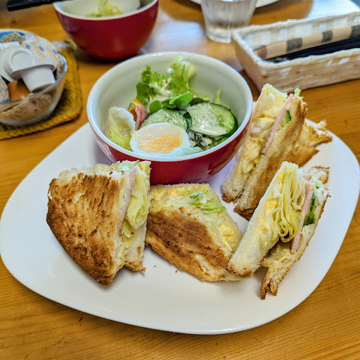 卵サラダにレタス、キュウリ、ハムが入っていて こちらはパンを焼いてくださっているので サクッとした表面とふわっとした食パン生地が 味わえてめちゃおいしかったです。