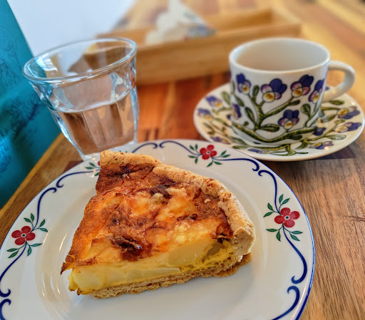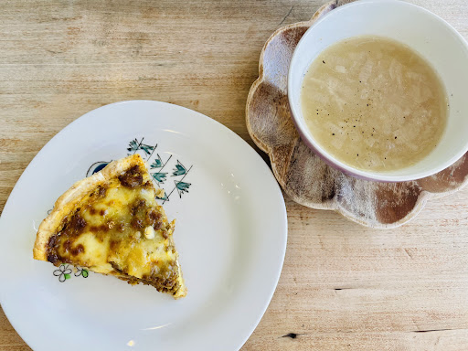 Read more金曜日にお邪魔したので、パンとスープの日でした😊 注文したのは、“キッシュとスープとドリンクのセット”です♫ 当日は3種類のキッシュの中から、“ドライカレーとゆで卵”をチョイス! 挽き肉たっぷりのドライカレーとゆで卵が重なったキッシュは、食べ応えあり✨外側サクサクのパイ部分は、玉葱スープと共に食べると、実に美味しい〜🫶食後のコーヒーも挽きたてで、最高の一杯でした☕️ パンやケーキをテイクアウトするお客さんが、沢山いました!焼き菓子などの種類も豊富で、美味しそうでしたよ♪