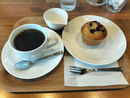 Read moreジャズが流れているゆっくり過ごせるカフェです。 マフィンセット注文しました。 ラムレーズンとクリームチーズのマフィンの注文したので、合うコーヒーを聞いてキリマンジャロのコーヒーにしました。 苦くなくほどよい酸味なので、マフィンの甘さを邪魔しなくて良かった。最後に抜けていくラムの香りともベストマッチでした。
