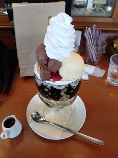 コーヒーフロートとカフェモカアイス、デザートはモンブランとアップルパイをチョイスしました。 合わせて2200円ぐらい。 コーヒーがこだわりの炭火焙煎ということで、深い苦味と上のせアイスの組み合わせが最高でした!(カフェモカにはココア味の甘さ控えめクリームが乗ってました)