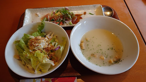 用事があり遠出してきたので、近くに良いランチはないかと検索。 こちらがコース式のような内容なのに、とてもお得で良さそうだったのでお邪魔しました。 …が、初めの段階からホール担当のスタッフさんがもたもたしていて、お茶が出てくるまでにも時間がかかり、初めての訪問だったので、どこからメニューを選べばいいのかもわからなかったのですが、ただただお茶がくるまで待つしかなく…。 私達が一番乗りだったようですが、最初の前菜が出てきて食べ終わってから、次の料理が出てくるまでにかなり時間がかかり、テーブルに何もない時間が続きました。 そしてやっと出てきた鯛のアクアパッツァは、揚げたてであろう鯛や素揚げされた野菜は熱かったのですが、スープや貝類はぬるかったりと温度差があり微妙でした。 そしてメインの握り三貫と寿司ロール四巻ですが、全体的にシャリがパサパサしていて、握りはワサビがたっぷりと入ってたり、掠ってついたぐらいの入れ忘れかのような量だったりとバラバラで、盛り付けも、もう少しちゃんとしてくれれば…といった感じで米粒が散らかってたりしていました。 最後のデザートとコーヒーなのですが、友人は既に寿司を食べ終わっていて、私はまだ半分残って食べてる状態でしたが、すぐにケーキとホットコーヒーが出されて…え?(-_-;)と。 せめて『もうお持ちしてもいいですか?』ぐらいの声掛けは欲しかったです。 せっかく楽しみにして入ったのに、残念な気持ち...