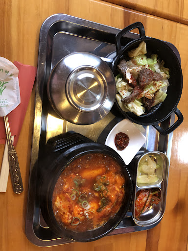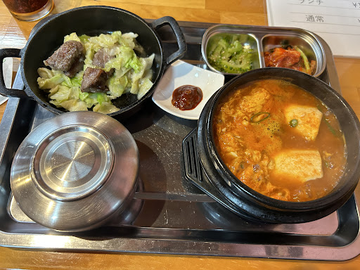 熱々のスンドゥブ、牛肉とキャベツ炒め物、キムチなどなど、スンドゥブは辛かったけど豆腐も沢山で美味しかったです! 牛肉とキャベツの炒め物はニンニクが効いてました。 ご飯が足りなくなりそうだったので、次からは大盛りにしようと思いました...