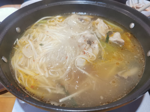 のぼりに出てたタッカンマリを注文。 本場韓国や東京大久保で食べるタッカンマリとは別モノ。タッカンマリは鶏が丸々一羽入っていることが通例。最低二人でも鶏一羽食べるんだが、今回は3人で丸鶏ではなく、バラけた鶏が入っていただけ。 来店前に「タッカンマリできるか?」と確認を入れて、出てきたのは単なる鶏鍋でしかなく、、、調味料が韓国っぽかったけど、あれで3800円?っていうのは、、、