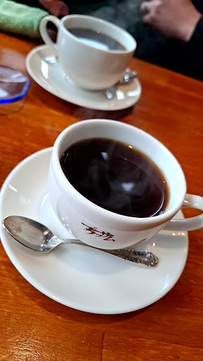 Read more三角屋根と棟の大きな「COFFEE」の文字が印象的。店内は高い吹き抜け、梁の構造美が印象的な明るい空間。そして、オープンから変わらない昭和の古き良き雰囲気が現在進行形で存在している、博物館級の素敵な「喫茶店」。