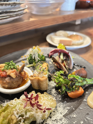 飯塚にある【Restaurant 菜の実】さんに少し前になりますがランチにお伺いしました ナビではお店の裏の通りを案内されましたので少し迷いましたが お店は通り沿い 敷地内にはいくつかのお店があり共有の駐車場があります ランチは2部制 後半の13時15分からのランチを予約して訪問しました 店内はアンティークな雰囲気で落ち着く空間 テーブル席が3席と 窓側にカウンター席がありました 今回は菜の実ランチをいただきました 美味しいスープからスタート 菜の実さんは、元々、この場所でパン屋さんとして長く愛されてきたお店とのこと 3種類のパンはどれもこだわりがつまっていてとても美味しかったです バゲットにはピーナッツバターが塗られていてこのバターが絶品 テイクアウトもできました バジルが香るフォカッチャ そして、米粉の食パンが絶品 生地はきめ細かく、しっとりとしていてとても美味しかったです 綺麗に盛り付けられた前菜プレートが登場 シェフがお店の中央で丁寧にご説明いただきました 前菜はお野菜がたっぷり使われていました 空豆とブロッコリーのペペロンチーノ、スナップえんどうとジャガイモ 茄子にあまおうとクリームチーズとケールのバルサミコソース キッシュに芽キャベツのフリッターもとても美味しかったです パスタは3種類から選ぶことができましたので、海老と小柱とズッキーニのオイルパスタをいただきました 素敵な空間で美味しいランチをいただくことができました またぜ...
