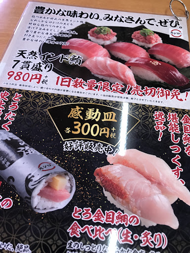 Read moreたまに来店します。 私たちの真後ろで、おばさん従業員さんがレーンを挟んで向こう側の従業員さんと普通の声のトーンでやり取り。気になるから一様トーン落としてほしい。人としてのマナーだろう。しめに大学芋を頼んだらガチガチに凍っていて噛めず…交換を頼む。今日の芋はすべて凍っていてお出し出来ませんと従業員女の子。 わかりました、と返事したものの、そんな業務説明ある?そんなのさっき出したの?メニューの芋、準備中に。苦笑。 その日のシャリはボソボソでした。 帰る時もそばにそのおばさん従業員さんが居たけど、ありがとうございましたの何もなし。 ネタが大きい100円キャンペーンの寿司は満足感あり美味しいけど、 従業員も寿司もイマイチだとやっぱり100円寿...