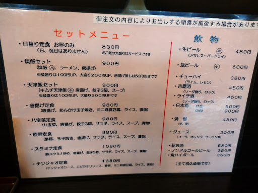 まず、お店は調理、提供、会計を 2人でされています。 座席は4名カウンターと 2名の離れたカウンターと 4名テーブルが2箇所にあり、 細長い店内にカウンターと 並走する形で設置されています。 各テーブルにはお冷のデキャンタが ありカウンターにも席にそれぞれ 置かれています。 メニューには定食、セット、おすすめ のページの裏に中華の単品一品が 掲載されています。 定食、セットには細かく何が何個 くらいで何がついてくるか、 や 大盛りはいくらかが 表記されています。 小飯もあるようです。 オーナー兼ね料理長が 身体をゆすりながら丁寧に 仕上げられて提供されていきます。 お手伝いさんがホールにおられる ので、配膳と注文を聞いてもらうのと お会計をしてもらっています。 注文内容にもよって前後したりします。 お料理は美味しいです。 ボリューム多めです。 味が丁寧でしっかりなのに ちょうど良い加減です。 定食でほぼ定番料理でお腹いっぱい 食べれます。 ご飯は定番の量でも多めです。 大盛りはどんぶり鉢に入って 出てきて、 一瞬、やっちゃったて 思います。 オーナーは常に動きまわってます。 お手伝いさんも忙しそうなので 営業中も休憩中も 電話はほぼ留守電になります。 営業開始はランチ営業と 17時半から18時からされています が看板の電気がついている時は お席に空席がありますの 合図ののようです(笑) 看板の電気が消えていても 満席、でお待ちがいる場合は 営業されています。 オススメの看板が外に出ていても なおされて中にある場合も 営業されている時があります。 電話には出れないので留守電です(笑) カウンターが多い配置ですので 1名ないし2名なら回転は早く 待ち時間も少なめです。 7名で来られた家族連れも 見たことがあるのですが 2テーブルに分かれて待って おられました。 お客さんは地元の人が多いですが 食べたらすぐ会計されて早めには まわっているようです。 令和5年、5月の時点で 駐車場は2台あります。 お店の最新情報で写真を掲示して いる方が いらっしゃるので参考になります。 お店の料理は大変おいしく 価格も定番ラーメン、450円と 今時あり得ない安さ、量も多く 味の濃さや加減も良い、 オーナーがすごく丁寧で気さくで 接客も申し分ないです。 価格は少しオーナーの お身体に還元しても良いのではと 思うくらいです。今時、安すぎます(笑) 価格が変わっても良いので通いたい 地元に愛...