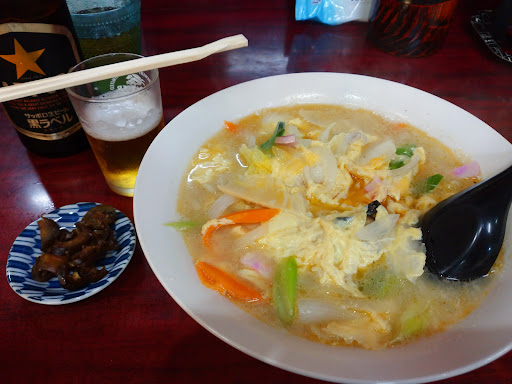 *** 初来訪、土曜日13時。入口小さいがカウンター3、4席と座敷に2テーブル?客いなかったが、テレビついててよくある町中華の雰囲気。整理整頓されてる。メニュー豊富で迷ったが中華スープの味見したかったので五目そばとビール注文。すぐ出てきた。かなりボリューミー。期待どおり美味しかった。また訪れます!