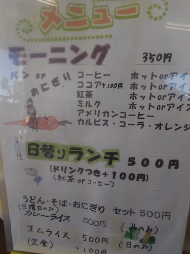 お店が出来た頃から年に何回か墓参りに行く途中で立ち寄ってます。モーニング350円(パンかおにぎり)ランチメニュー500円(色々) だいたいバイクで寄る時が多いのですが、バイクメンバーも連れて行く時もあり、結構気に入ってます。障がい者の若いスタッフの方が頑張ってる姿がありとても応援したくなります。だから開いてれば寄るつもりで前を通ってます。コスパもいいしそんなに混んでな...