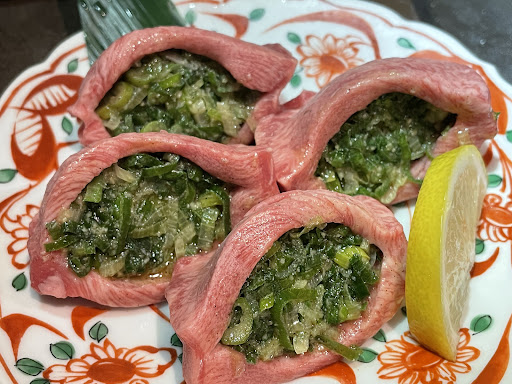 お通し(400円税別)の煮込み、めちゃ肉柔らかく煮込んであって旨し。 キムチ盛合せ3種(650円税別)。 焼肉のタレとしては、特選付けダレ・生レモン・ネギ塩昆布・自家製黒味噌が用意される。 まずは、名物厚切りネギ包みタン(1880円税別)をいただきますか。 おいなりさんみたいに青葱をタンに詰めたものだ。ネギは胡麻油でぎゅっとなっているのでポロポロ脱出しないので、タンの各面をいい感じに焼き上げて。 ネギ好きにはいいアイテムなのと、そもそもタンがいい歯応えと噛むほどに出る旨味がグー。