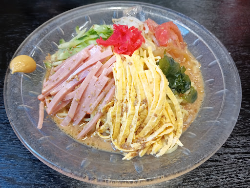 裏メニューにチャーハンが有るの知ってるけど、そこまで常連でもなく勇気が無くて、未だに頼めてない、いつか頼めると良いな。 2025/9再訪 ーーーーーーーーーーーーーーー 「ごまだれ冷しラーメン」 暑い日だったので注文、夏季のみ、9月入ってたけど未だやってて良かった、氷が涼しげ