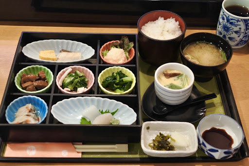 ◆日替わり定食(吹き寄せ弁当) 税込 1,100円 細かく仕切られた大きな重箱の中に色々な料理がありますね。 烏賊の刺身、帆立の刺身、ハマチの焼き、だし巻き卵、鰹の角煮、ゲソと胡瓜の酢の物、小松菜のお浸し、 南蛮漬け、ポテサラ、茶碗蒸し、味噌汁、漬物、ご飯。 どの料理もなかなか美味しくて、種類が多いから楽しめる♪ さすがお寿司屋さんだけあって烏賊とホタテのお造りは小さいけれど甘みが強くて美味しかった。 そして茶碗蒸しも出汁が効いていて美味しかったな。