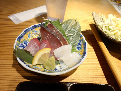 唐揚げ定食はミニサラダ(キャベツ)、小鉢(日替わりのようです)2品、味噌汁と大きな唐揚げが4つも入って550円です。今の時代こんな値段の店存在したんですね。ご飯大盛りも無料です。 唐揚げ定食大盛りは100円増しで唐揚げが+2個になります。以前行った際は写真の状態プラスあとから小皿で2個出てきました。超満腹です。欲を言えば、大盛りのときは味変としてマヨネーズとかあれば嬉しいですね… ランチでは刺身3種盛(日替わり)を200円で付けられます。写真の日はカツオ、ハマチ(?)、イカでしたが、別の日はタイに変わったりしてました。
