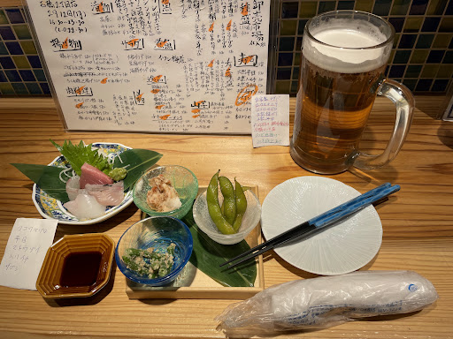 こちらのクチコミをみて伺いました。 最初わからないので刺身5点盛りと、肴3点盛り盛りを頼みました。 金麦?メガ358円位なのでそれもお願いして、その後も何品か注文しました。 飲み物も安いし、一人飲みには最適な量なのでその点は大満足でした。