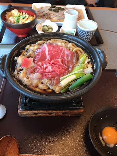 ・すき焼きうどん お鍋の中にコシのあるおうどん、 その上に 特選牛が数枚、葱、キノコが のせられています。 固形燃料に火が点され、グツグツと 温められたものに卵を潜らせて いただきます。 かなりしっかりとした、濃いめの 割下で煮込まれているので、 卵をつけていただくと まろやかな味わいになります。 割下の甘辛さが具材とおうどんに 絡まる、温かい鍋うどんです。