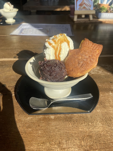 Very cute Café. At the little shop, which is incorporated in the cafe, one can find cute things as cards, bags, and souvenirs. Cozy atmosphere and friendly english speaking staff. My Ice cream was very nice and the taiyaki was freshly made and warm which was super delicious. Perfect place to wait for...