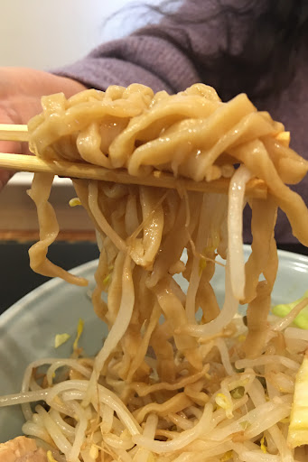 麺は平打ちの中太ちぢれ麺。 やや細めで柔らかく感じた。 「俺の生きる道」「雷」などの、他の二郎インスパイアのような、太めのワシワシ感は無い。