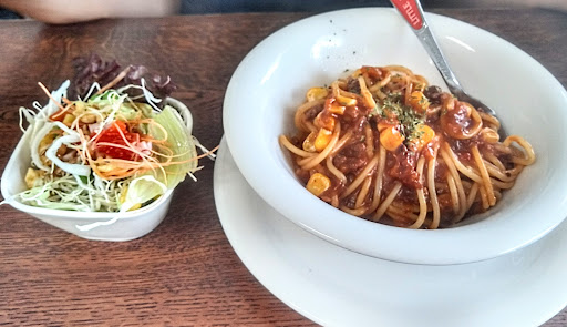 当初は別のお好み焼き店を目指していたのですが、ふとスパゲッティの看板が目に入り、しかし看板は半分くらいなくなっているので営業しているのか怪しいなと思いながら中を覗くと、お二人ほど食事をされていたので思い切って入ってみました。 迷った末に、きのことトマトのスパゲッティのセットにして提供を待っている間、先の2名の方が食べているクリーム系のパスタ(恐らくその日のオススメパスタ)の方が正解だったかと後悔していました。 私が注文したのはセットの中でも1番価格の安いものでしたが、提供されたスパゲッティには、マッシュルームや舞茸、しいたけなど数種類のキノコが入っており、パスタソースにチーズも含まれていてとても美味しく頂きました。きのこ自体鮮度の良いものが使われているなと感じました。 他の方の評価にもありますが、麺が若干固いかな......