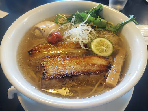 Read more法事で初めて愛媛県へ。 松山空港から今治の方へ行く途中何かお昼を食べようとなりフラ〜っと入ったのがりょう花でした。 入ると元気な声で店員さんがお出迎え感じもよくお店の雰囲気もいい感じでした。 9人と大人数だったので2テーブルに別れました。 9人中2人は塩ラーメンが好きでなく味噌ラーメンを注文。 私はすだちか梅で悩み梅の塩つけ麺を注文しました。 初めて食べるつけ汁の味に凄く感動しました。塩つけ麺なので塩味は強めでしたがもちもちとした平麺に絡む味が何とも言えない初めて食べた優しい味に虜になりました。 柚子胡椒もテーブルに置いてあったので味変しながら食べれました。 つけ麺の1人前の麺の量は多めで少し息子に食べてもらいました。 残念ながら梅が硬めでスープに溶けなかったのでもう少し柔らかい梅だと良いなと思いました。