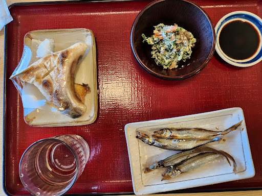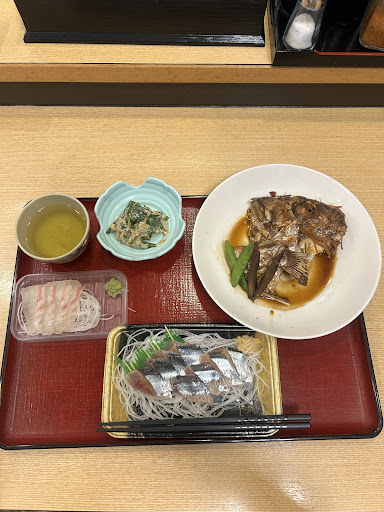 Sashimi, simmered fish, grilled fish, and vegetable side dishes are all lined up, and you can freely choose what you like — such a fun style of dining. That day, I tried sashimi of Pacific saury and simmered sea bream, both incredibly fresh and full of flavor. The sea bream from the Seto Inland Sea was especially outstanding. It truly felt like a market atmosphere, and I was able to fully enjoy fish during my lunch...