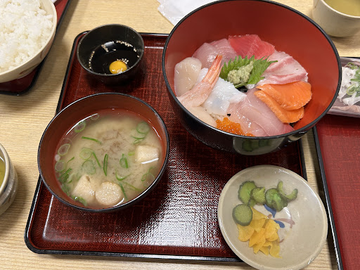 This is a shokudō, which means you can expect cheap (but usually tasty) food that's cold and you have to warm it up in a microwave (available on-site). In this one there was lots of variety, as far as the food is concerned and the food was tasty. We ordered the seafood ricebowl (Kaisen-don) with a side of different fries food. The fish was tasty, but it was served on warm rice, which made the sashimi on top warm as well. Warm sashimi is not very tasty. However the price was not very reasonable. We hardly ate anything and...