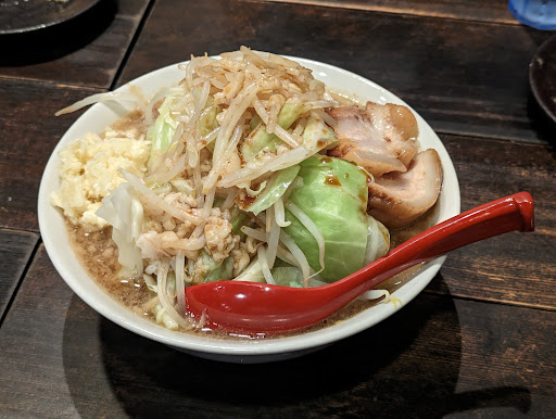 豚野郎、ヤサイマシ、アブラマシ、ニンニクマシ、濃い目、だ。 麺が太く、かたさも良くてもちもちでうまい、味もいい、チャーシュもとろけてうまい、食べたあとは本当に満足感でいっぱいだ。 もしたくさん食べれる人は大盛りにチャレンジしてほしいと思う。僕にはちょっと大きすぎるが、食べている人はとても満足そうな顔をしていた。 ただニンニクには注意してほしい、とてもうまい。が、食べたあとは家族にラーメンを食べたことがバレてしまうので注意だ。 あとは、カツ丼の上や串揚げとか食べたが、特にカツはすごい美味しい。外はサクサクで、中はしっとりだ、是非食べてほしい。 この店は茹でたり揚げたりのかたさ加減がとても上手だなと思った。 値段もそんなに高くないし、色んなメニューがあるし...