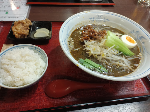 ラーメン、唐揚げ、漬物が付いてきました。 黒チャーハンは、見た目と違って味付けは濃く無く、しっとり系で美味しい。最初に少し甘さが感じられて、最後に少し辛さがあります。辛さは優しい感じで、後に引かないです。味が濃そうな見た目なのに、最初甘さが来るので脳が少し戸惑いました。醤油等の香りが余り感じられず、もう少し風味が足されると良いかな。 ラーメンは、アッサリスープで美味しい。もやし、叉焼、ネギ、ワカメ、ナルトと具材も多いです。 唐揚げは、サクサクで下味がしっかり系でした。