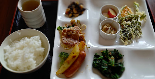 é£äºå 容ã¯ããã¥ããã§åœ¢åŒïŒ ãã€ãã³ã°åœ¢åŒãªã®ã§ãæéãæãå Žæã«ãé£ã¹ãã»é£ã¹ããé£äºå 容ãåãå ¥ããç¿ãšããè¶ïŒã飲ãã³ãããä¹ãããçã眮ããŠããã®ã§ããããåãåã£ãŠããŒãã«ã«çããŸãããããŒãã«ã®èã«è·ç©ã眮ããŠãé£äºã¡ãã¥ãŒå 容ãåãã«è¡ããŸããã